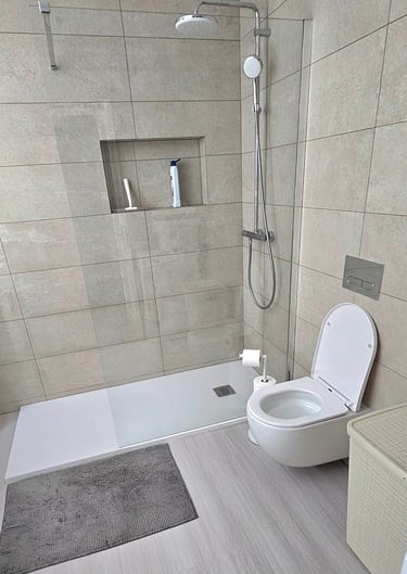 High-quality double box spring beds ensure a restful night’s sleep, while built-in cupboards provide generous storage for your belongings. Stylish décor creates a calming atmosphere, complemented by air conditioning for year-round comfort. The double bedroom is equipped with a flat-screen television—perfect for relaxing at the end of the day.